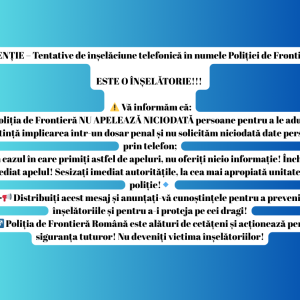- În cazul în care primiți astfel de apeluri, nu oferiți nicio informație! Închideți imediat apelul! Sesizați imediat autoritățile, la cea mai apropiată unitate de poliție, sau depuneți o petiție și pe site-ul oficial: www.politiadefrontiera.ro → secțiunea „Petiții”.