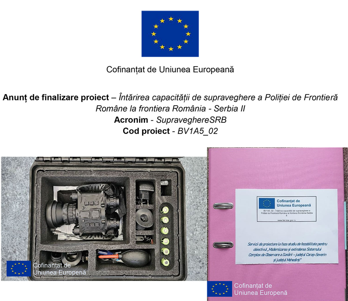 În luna iulie 2025 s-a finalizat implementarea proiectului Întărirea capacității de supraveghere a Poliției de Frontieră Române la frontiera România-Serbia II, Acronim - SupraveghereSRB, Cod proiect - BV1A5_02, Finanțat din Programul Național 2021-2027 Managementul frontierelor și vize. Proiect implementat de către Inspectoratul General al Poliției de Frontieră.