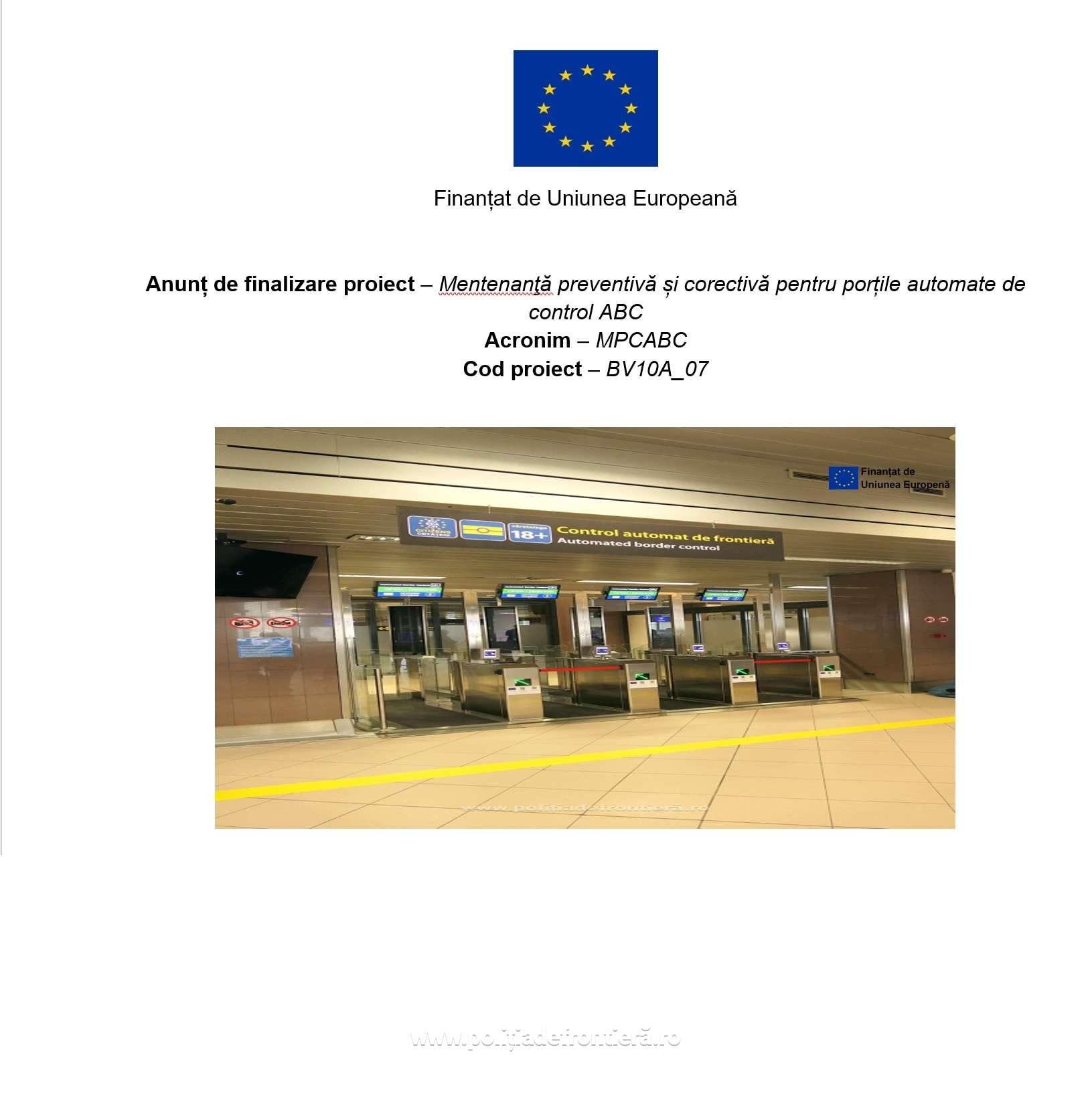 La nivelul Inspectoratului General al Poliției de Frontieră au fost finalizate activitățile derulate în cadrul proiectului – Mentenanţă preventivă și corectivă pentru porțile automate de control ABC, Cod proiect – BV10A_07, Finanțat din Programul Național 2021-2027 Managementul frontierelor și vize.
