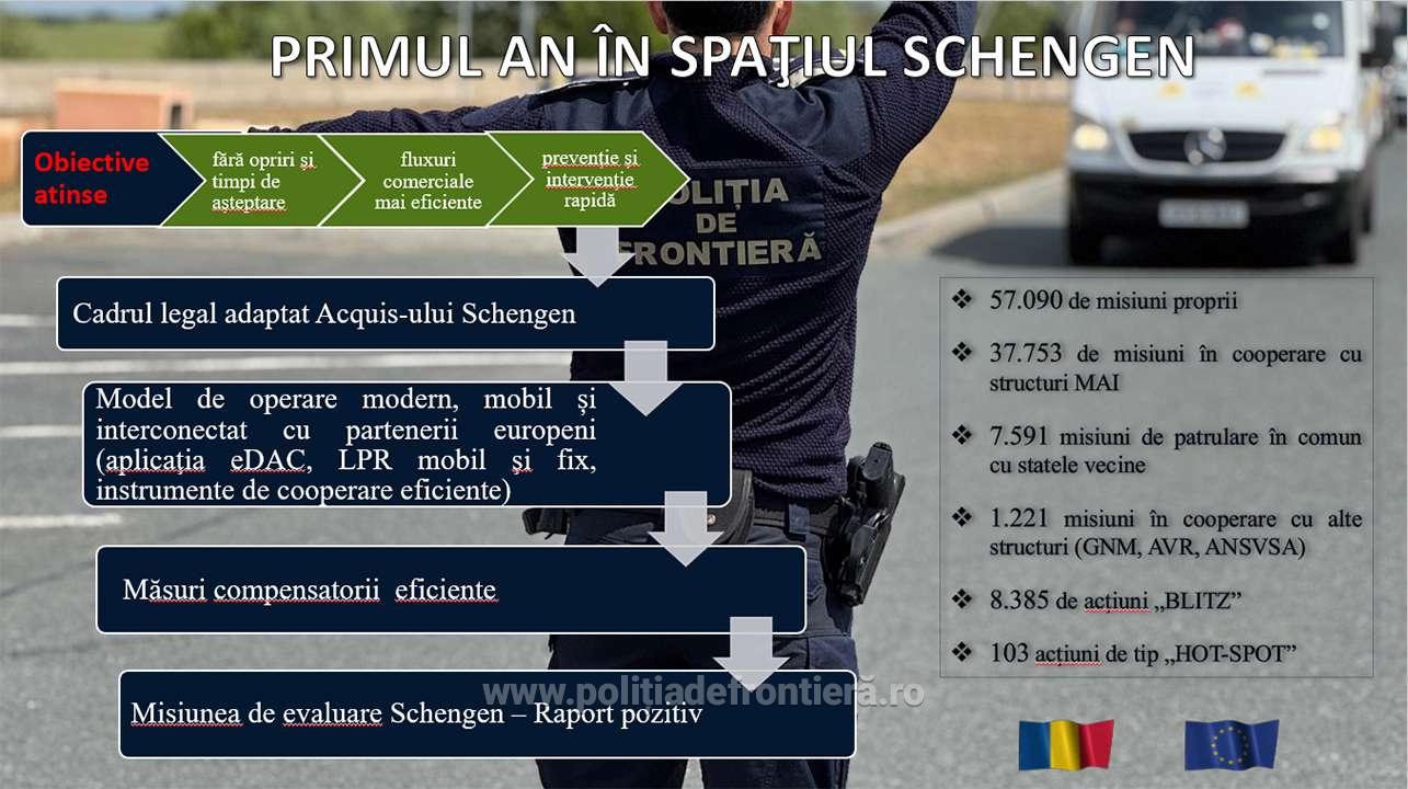 Integrarea deplină în Spațiul Schengen a presupus o transformare profundă a modului de operare. A fost adaptat cadrul legal național pentru respectarea integrală a acquis-ului Schengen și a fost introdusă tehnologie modernă în activitatea curentă.