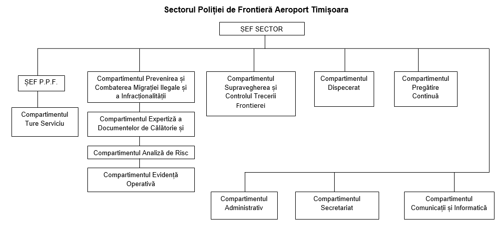 Sectorul Poliţiei de Frontieră Aeroport Timişoara este subordonat nemijlocit Inspectoratului General al Poliției de Frontieră Române și funcționează în regim de trafic internațional cu specific aeroportuar, asigurând respectarea prevederilor tratatelor, acordurilor, convențiilor și protocoalelor de frontieră și internaționale la care România este parte, având ca obiect de activitate deservirea liniilor aeriene și aeronavelor ce operează în trafic international, destinate transportului de persoane și marfuri peste frontieră.
