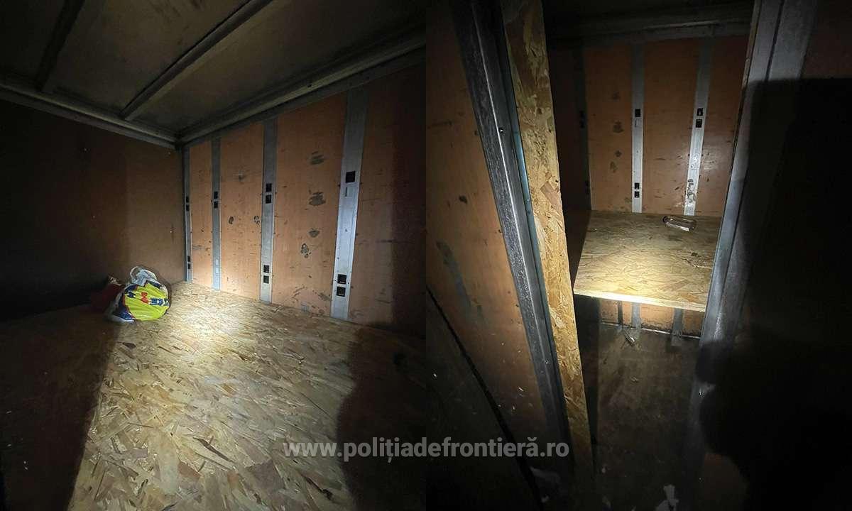 În urma efectuării controlului amănunţit al mijlocului de transport, au fost descoperiţi, într-un locaș special amenajat în partea din față a compartimentului destinat mărfurilor, șaisprezece cetăţeni străini.