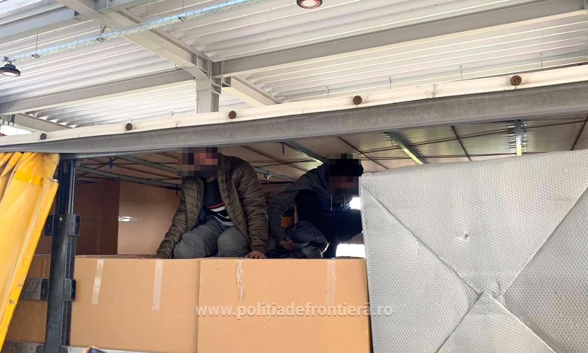 În urma efectuării controlului amănunţit al mijlocului de transport, au fost descoperiţi, ascunşi în compartimentul pentru marfă, trei cetăţeni străini.