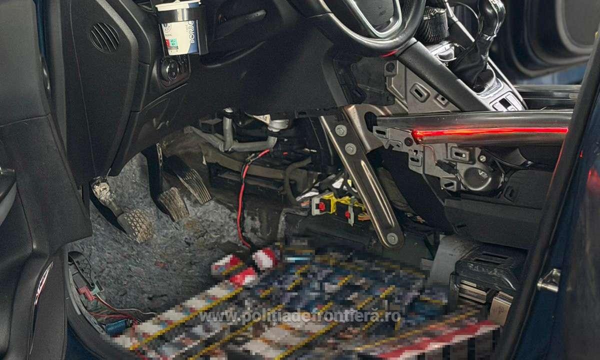 În urma controlului fizic al mijlocului de transport, polițiștii de frontieră au descoperit mai multe pachete de țigări, ascunse în podea, sub materialul textil, pentru care șoferul nu a putut prezenta documente de proveniență.